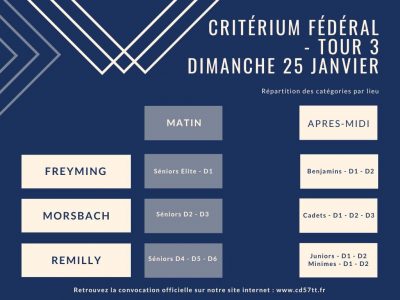 Le 3ème tour du Critérium Fédéral Départemental aura lieu à Freyming-Merlebach, Morsbach et Rémilly, le dimanche 25 janvier 2026. Retrouvez sur le site du Comité Départemental, la convocation officielle, la liste des ...